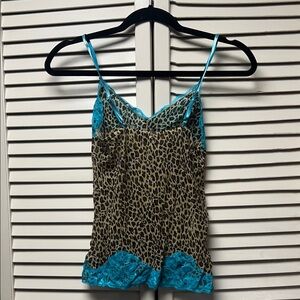 Stylish leopard print camisole. Features vibrant blue lace trim. Perfect for a bold look.