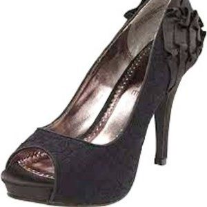 Rampage Platform Pump featuring black lace overlay with ruffled detail on heels cushioned footbed Size 8M approx 4.5" Heel 1" Platform very good preloved condition RAMPAGE caters to the contemporary woman, offering her eclectic, fashion-forward products to wear in every aspect of her constantly evolving lifestyle.