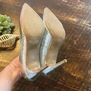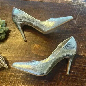 EUC! Right on trend with metallics taking center stage! The are a faux snake embossed leather and have a 3.5” heel and soft pointed toe.