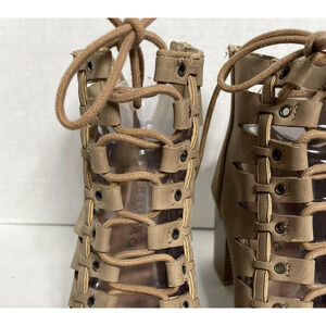 Rampage Tan Lace Up Boots Peep Toe Chunky Size 7.5