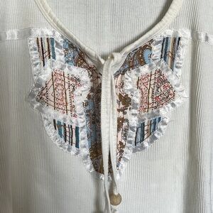 Super cute and unique ribbed tank top in off-white. Adorn with patchwork detail at the chest and wooden beads on running cords that you can tie or let down. Made of quality cotton. In great vintage condition.