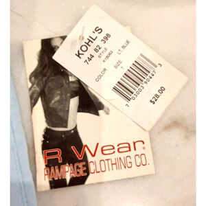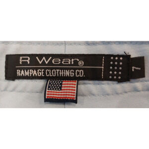 These are Rampage dress pants for women in a light blue color, size 7. They have a skinny leg style and a mid-rise waist of 30 inches. The pants feature a solid pattern with button closure and button accents. Made of 97% cotton and 3% spandex, they offer a comfortable stretch fit and are suitable for casual occasions in the summer, fall, and spring. Machine washable for easy care.