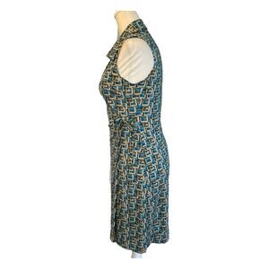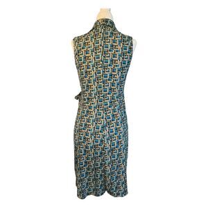 Rampage Clothing Company Wrap Dress in Blue Brown Tan and Cream Pucci Like Geometric Printed Pattern. It is a Sleeveless Full Wrap Midi Length Dress with a Collar. It is great for casual days at work, school, date night, night out with the girls, and Family Dinner. It would make a great Christmas Hanukkah Valentine’s Day Birthday or any Holiday gift!