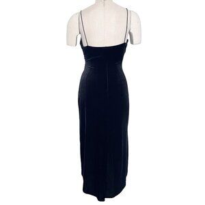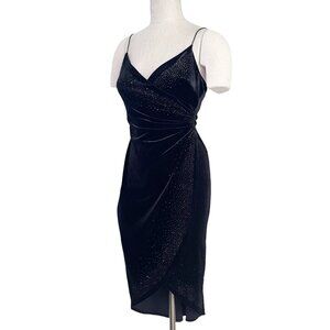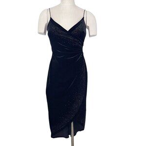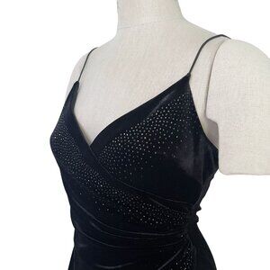 Vintage 90s/Y2K Rampage slip dress in luxe black velvet with sparkling rhinestone studs. Features a sultry surplice neckline, spaghetti straps, and a flattering tulip wrap hem for a glamorous cocktail look.