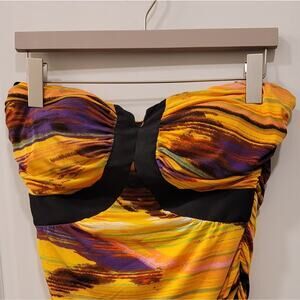 Ultra stretchy avant garde dress yellow, brown, green, purple and pink abstract print. Front draping and back ruching create a slimming silhouette on this yellow bodycon dress. Soft bra cups with contrasting black detail. Hidden back zipper. Vintage dress is perfect for date night, hoco, Halloween or a Vegas Bachelorette party. Keep tube top dress casual with a cropped denim jacket. Fully lined