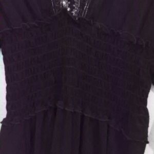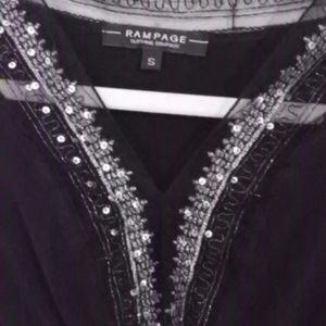Rampage black flowing top. Stretchy small size. Has silver sequence around v neck. Has a thick ruffled elastic band around waist. Great waist cincher! Has a slit on both underarm sleeves. Used once but in great condition!