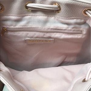 pink backpack with 1 zipper pocket and 2 insert pocket inside, and has nice tassels on side as detail
