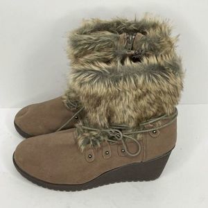 Brown Rampage Jaxson booties in size 11. Wedge style. No flaws. Faux leather and fur. Wedge heel is 3 inches. Shaft is 5 inches. Zip inner ankle.