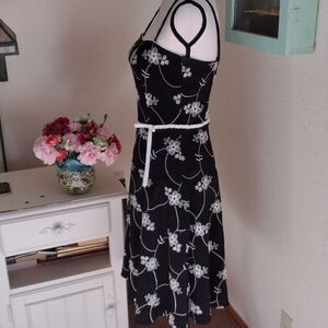 Made in the USA. Rayon blend black sundress. Fit and flare design. Embroidered everywhere with satiny white thread. Spaghetti straps, back zip. Stretch, princess seaming on bodice. Grosgrain at waist with a bow. Size 5 measures 35 at chest, 28 at waist, 42 at hips, 32 from under arm to hem. Cool and comfortable for warm weather. Wear a sweater or jacket for a perfect work look.