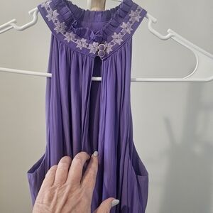 Elegant violet mini dress with halter neck. Features tiered layers and delicate lace details. Perfect for a night out.