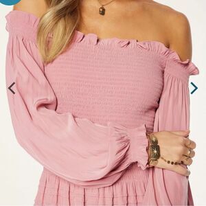 On or off the shoulder, smocked bodice, long puff sleeves, pleated detail at the waist.
