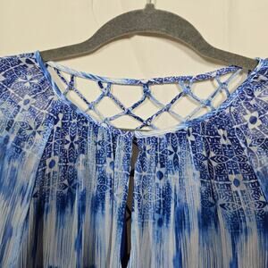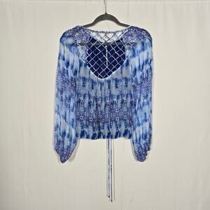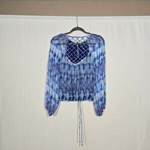 Featuring a beautiful blue tie-dye pattern and intricate macramé back detailing, this silk top is perfect for adding a touch of bohemian chic to any outfit.