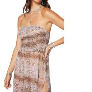 smocked bodice and sheer snakeskin print bring alluring seduction to this strapless cover-up dress.
