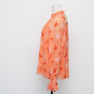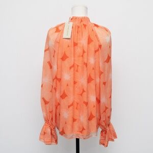 Add a soft splash of color to your wardrobe with the Ramy Brook Clarke Floral Blouse in a fresh peach print. This high-neck pullover style features a smocked collar, delicate split neckline with slender ties, and long sheer sleeves finished with flared ruffle cuffs for a playful, feminine touch. The lined body offers coverage while keeping the look light and airy—perfect for spring gatherings, brunch, or dressed-up daytime events. Crafted from 100% polyester and designed with Ramy Brook’s signature boho-chic flair>