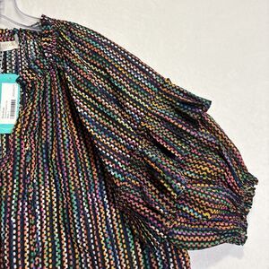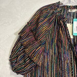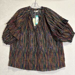 Ramy Brook Eugenia Ruffle Puff Sleeve Top Blouse Large Dot Stripe Split Neck NWT