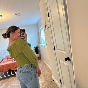 I adore this super pretty designer Ramy Brook green smocked square neckline long sleeve cropped blouse/top