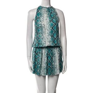 Ramy Brook Green Snake Skin Mini Dress 100% Silk High Neck Ruched Waist Small