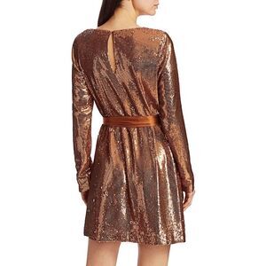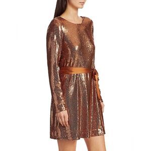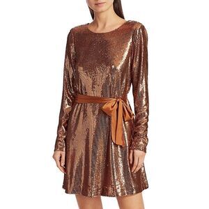 Crafted of high-shine sequins, this shift dress is modern in a T-shirt silhouette complete with sash tie.