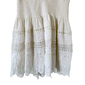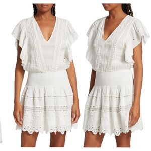 Ramy Brook's Harlow minidress is crafted of a linen blend. This eyelet-embroidered style features a V-neck, flutter sleeves, and a smocked waistband. V-neck Flutter sleeves Smocked waistband Pulls over 51% linen/30% viscose/19% modal Dry clean only Imported SIZE & FIT About 34" from shoulder to hem Model measurements: 5'10" tall Model is wearing a US size Small.