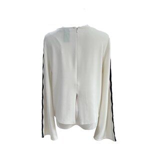 Step into timeless elegance with this stunning ivory blouse by Ramy Brook New York. Tailored for both office and upscale casual looks, this lined top features sleek black contrast trim along each sleeve and a subtle high-low hem for a modern finish. Crafted from a silky triacetate blend, it’s both luxurious and wearable.