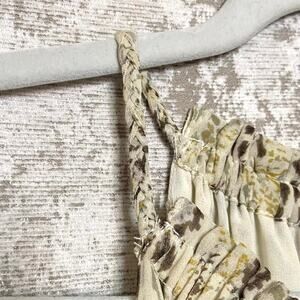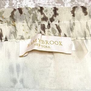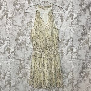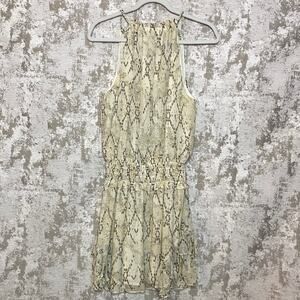 Gorgeous dress from Ramy Brook! Features mini length, halter neck, keyhole neckline, shirred stretch waist, braided straps, sheer snake pattern throughout, neutral color palette, and ruffle details on the sides of the skirt.
