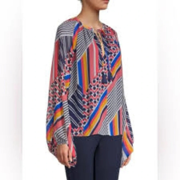 Ramy Brook Kayden blouse in multicolor geometric print. Ties at neck. Balloon sleeves. Fully lined. Polyester. Machine or hand wash. Excellent condition. Size M