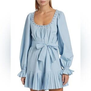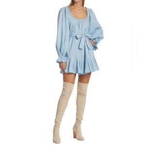 Key words: baby blue, belt, bow, pleated, pleat, baby doll, long sleeve