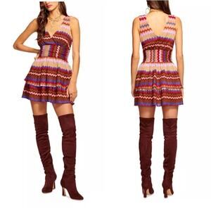 Ramy Brook Laura Knit Zigzag Metallic Tiered Mini Dress V-Neck Medium NEW