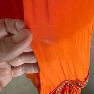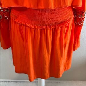 Bright orange halter dress with embellished sleeves. Perfect for a bold look. Embellished sleeves with gold hardware, hook and eye closing. No notable flaws in EUC