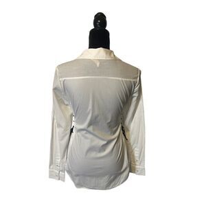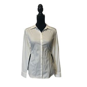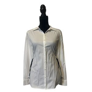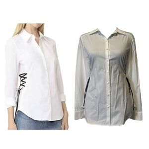 Ramy Brook Lila Corset Side Lace Up Button Down Top Optic White & Black. Features black contrast corset style lace-up details add the perfect finishing touches to this button down blouse. Spread collar. Long sleeves. Front button closure. 98% cotton, 2% spandex. Measurements in pictures.