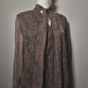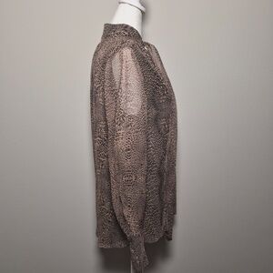 This Ramy Brook silk blouse has a one of a kind leopard print. As you guide your eyes around this print up close, you'll notice how it varies in size and direction and contorts.