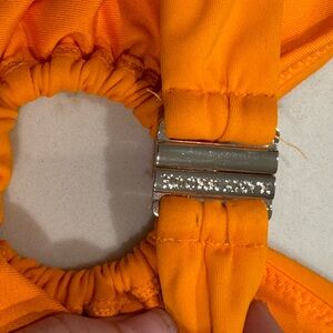 Dive into summer with the Ramy Brook Orange Halter Bikini, featuring a striking ring detail at the center. This vibrant bikini is designed with a smooth, solid finish, making it a standout choice for beach days. The halter strap adds a touch of elegance, ensuring you look chic and stylish by the water.