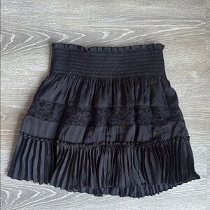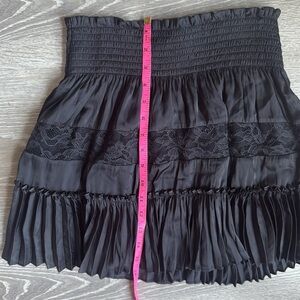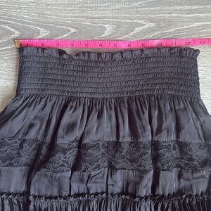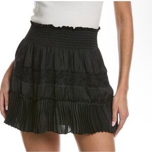 About the brand: Silk fabrics, lively colors, and sophisticated silhouettes. Mini Skirt in black with tiered lace design and smocked waistband. Slip-on styling 100% polyester Hand wash Imported
