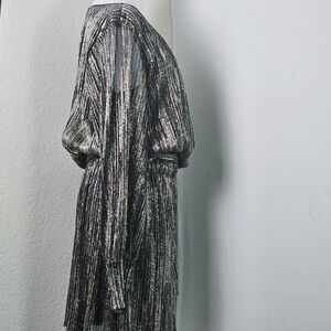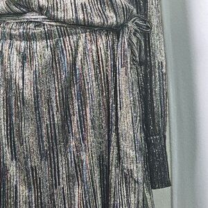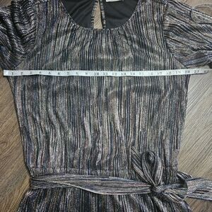 Shimmer in style with this elegant metallic striped dress. Perfect for any occasion, this dress features a stunning blend of black and silver hues. The belted waist adds a flattering touch.