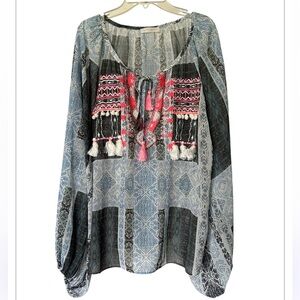 Ramy Brook Myra blouse sheer blue multi embroidered tassels Size S