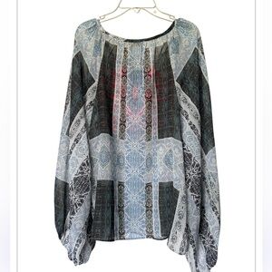 Ramy Brook Myra blouse in blue multicolor graphic print. Hot pink embroidery. Tassels Sheer. 100% poly. Dry clean recommended. Bust 20” length 23”. Excellent pre owned condition. Size S