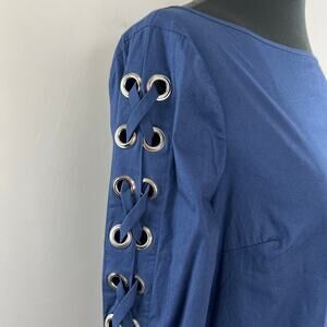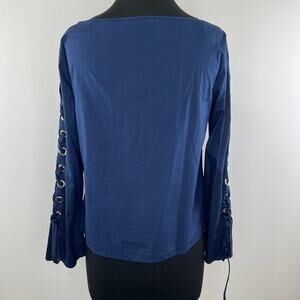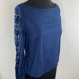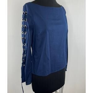 Ramy Brook NY Blue Boat Bateau Neck Lace Up Long Sleeves Pullover Blouse Size S