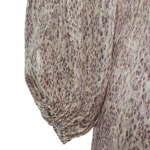From Ramy Brook New York, this is the Printed Amalia Dress in Size 00. The 60% silk and 40% metallic cocktail dress is extremely lightweight, even with the 100% polyester lining. The dress features a plunging neckline and is a wrap-style dress. There are two hook-and-eyes on the belted area. One of the two loops is starting to come out, but is still usable. The only other flaw is that the left shoulder has ever-so-slight fraying where the seam comes together, closest to the neck. Otherwise, the dress is in excellent pre-owned condition.