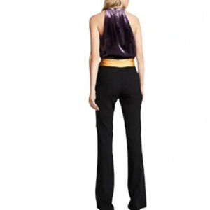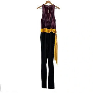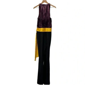 This beautiful jumpsuit features a deep v crossover neckline and a gold sash tie. Side seam zipper closure. Soft velvet upper. Solid black crepe pants.
