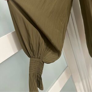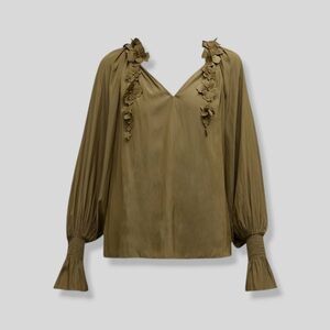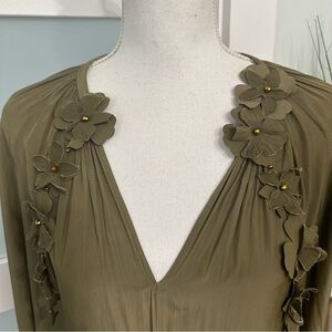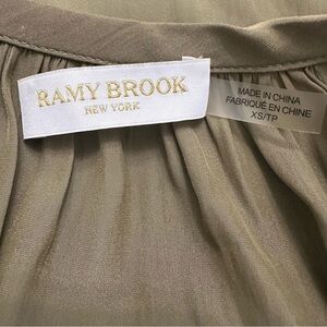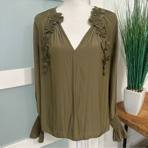Ramy Brook Olive Green Emelia Floral Applique Top SZ XSmall Designer Is In Great Preowned Condition Except For Removal Of All But One Floral Appliqué On Neck. SEE CLOSEUP PHOTO. Perfect for any occasion, it offers a comfortable fit with its flowing sleeves and chic cuffs. Features: • Floral Appliqués Drape Neck Front • Gorgeous Long Balloon Sleeves • V-Neckline • Smocked Bell Cuffs • Slipover Style • Hip Length • Relaxed Fit - Easily Fits A Small & Medium • Measurements - Displayed On Photos • Material Content Tag Displayed On Photo Bundle & Save Please See All Photos Ships Within 24 Hours Of Payment Please Ask Any Questions Prior To Purchase All Items Are Listed On Other Platforms/Try My Best To Remove Items Once Sold Bin - M56