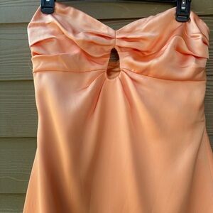 Beautiful dress with a couple flaws. The tie is missing, but the dress is still completely wearable—it just has a little peakaboo now. Other than that there are some runs in the fabric, which is common with this fabric. See all photos.
