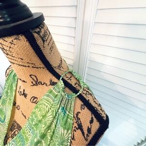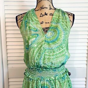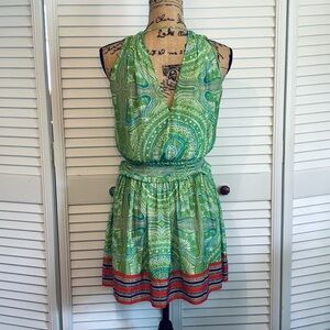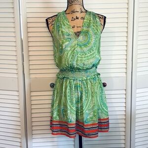 Description: Ramy Brook green, white, and orange patterned mini dress with a v-neck and a stretchy waistband