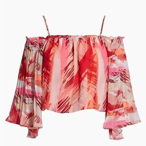 Off-the-shoulder top with an abstract palm tree print and pleated butterfly sleeves.