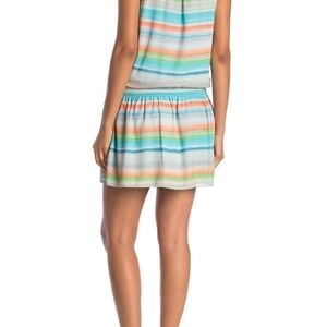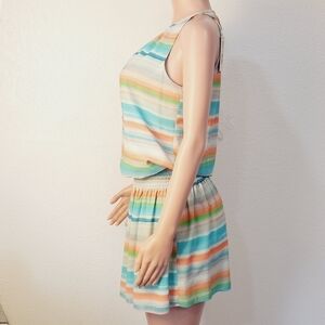 - Colorful stripes adorn this sleeveless mini dress with a cinched waist