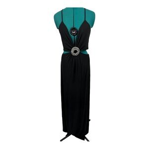 Cutouts have made a mark on the trend report and this gorgeously groovy maxi, centered with a showy beaded belt buckle, is a winning way to own the look. Plunge neck Adjustable straps 92% viscose, 8% spandex