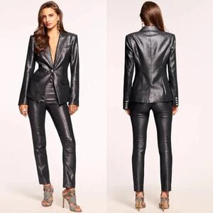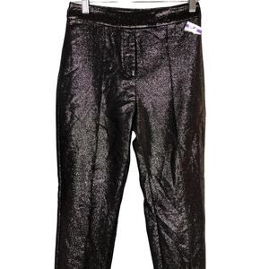 These Ramy Brook Saylor Glitter Pants are a stylish black metallic pair with a high-rise, skinny leg, perfect for adding a touch of glamour to your evening look. Ideal for cocktail parties, holiday events, or any special night out when you want to shine!