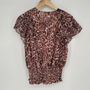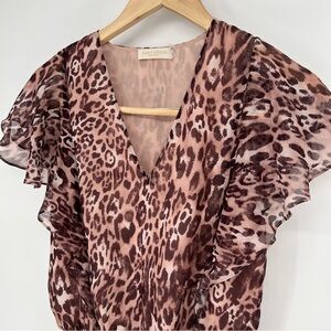 Gorgeous animal print top with flutter sleeve and ruffle detail. EUC. This item is preowned. Please check the photos closely for details on measurements and condition. Size XS.