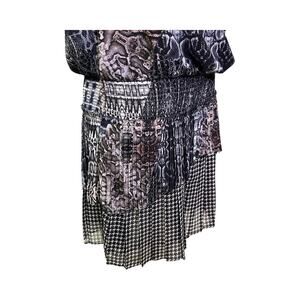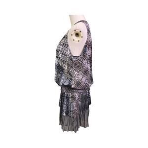 Striking Ramy Brook halter neck dress in a bold snakeskin and mixed geometric print, size Small. Designed with a pleated neckline, blouson bodice, and elastic waist for a flattering silhouette. This fully lined sleeveless dress features lightweight, drapey fabric perfect for summer events, vacations, or date nights.