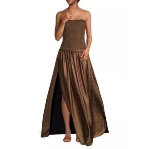The Calista metallic maxi dress from Ramy Brook features a strapless smocked bodice. A drop-waist skirt with a thigh-high slit defines the look.