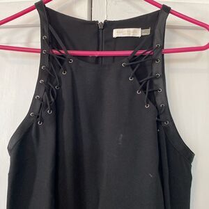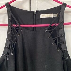 Ramy Brook little black dress with some goth flare. Grommets and rope highlight the collar bone. Sleeves and zipper are satin to contrast the matte black. Small imperfection shown in photos. Perfect dress prom or homecoming.